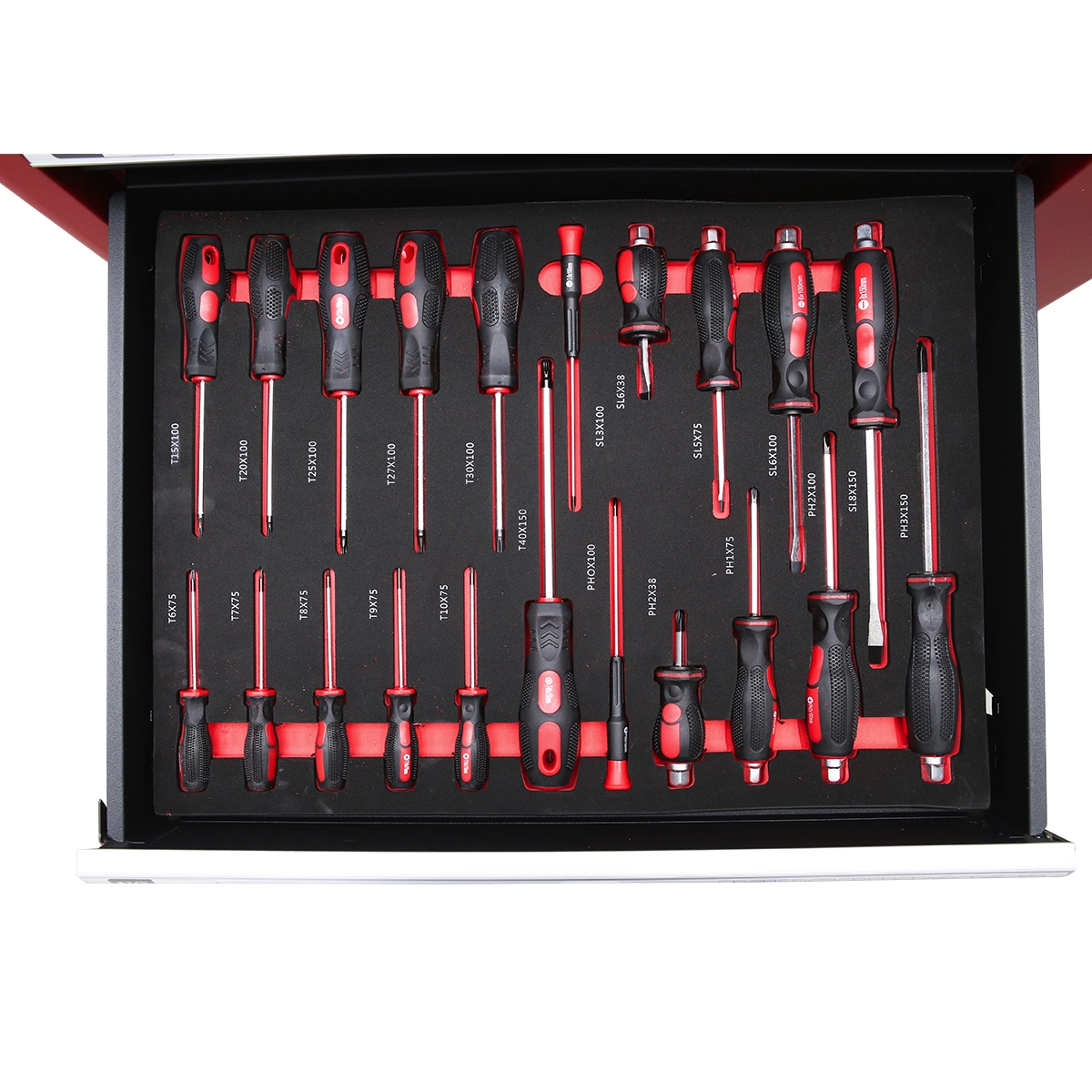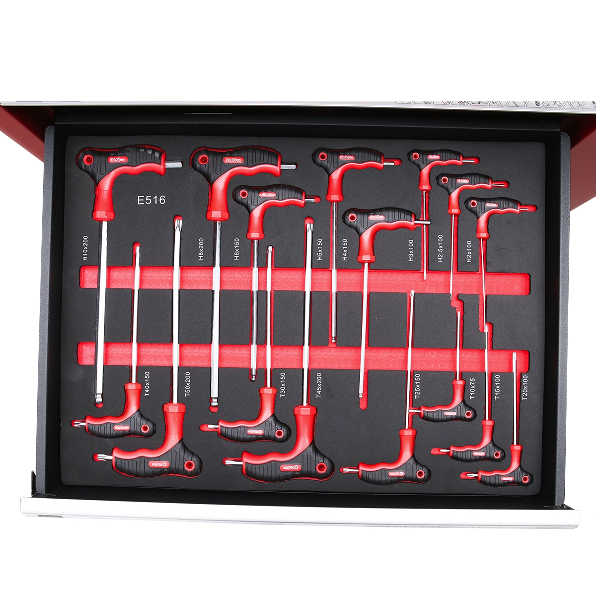 • 16 buc. surubelnite hexagonale si torx – H10X200, H8X200, H6X150, H5X150, H4X150, H3X100, H2.5X100, H2X100, T40X150, T50X200, T30X150, T45X200, T25X150, T10X75, T15X100, T20X100.
