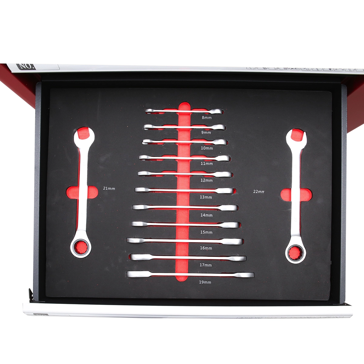 • 13 buc. cheie combinata fixa si inelara cu clichet – 8, 9, 10, 11, 12, 13, 14, 15, 16, 17, 19, 21, 22 mm