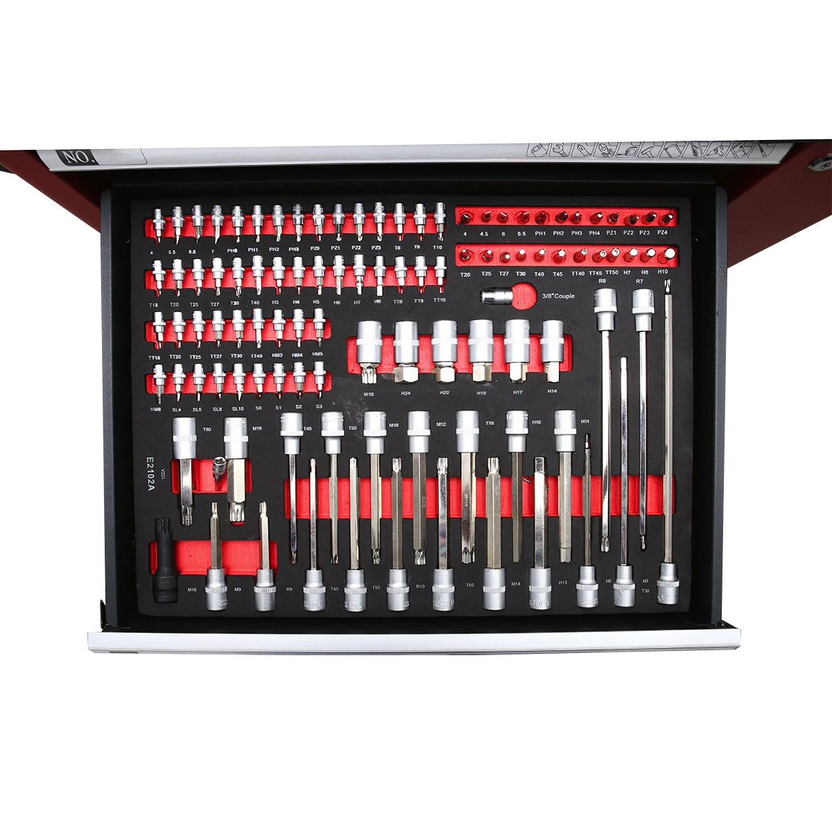 • 48 buc. chei 1/4” – 4, 5.5, 6.5, 7, PH0, PH1, PH2, PH3, PZ0, PZ1, PZ2, PZ3, T8, T10, T15, T20, T25, T27, T30, T40, H3, H4, H5, H6, H7, H8, TT8, TT9, TT10, TT15, TT20, TT25, TT27, TT30, TT40, HM3, HM4, HM5, HM6, SL4, SL6, SL8, SL10, S0, S1, S2, S3.
